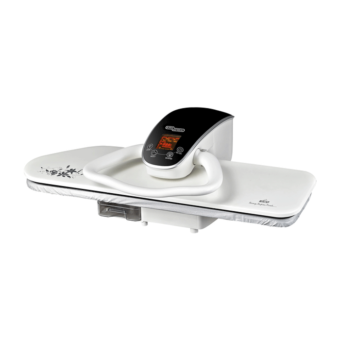 كما انها مزودة بشاشة رقمية تعمل باللمس للتحكم به و لاختيار مستوى الحرارة المناسب للقماش المستخدم كذلك يمكن ضبط خاصية