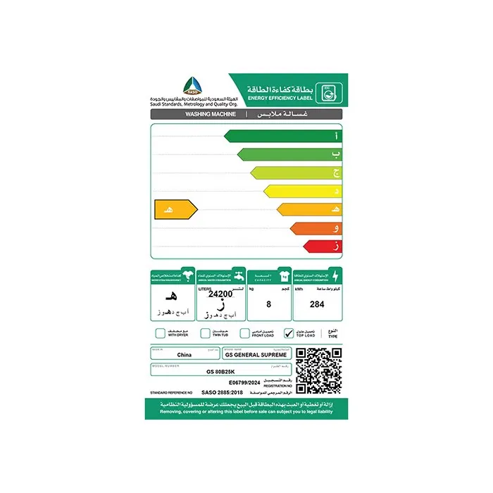 غسالة اتوماتيك جنرال سوبريم تعبئة علويه 8 كيلو 10 برامج فضي GS80B25K