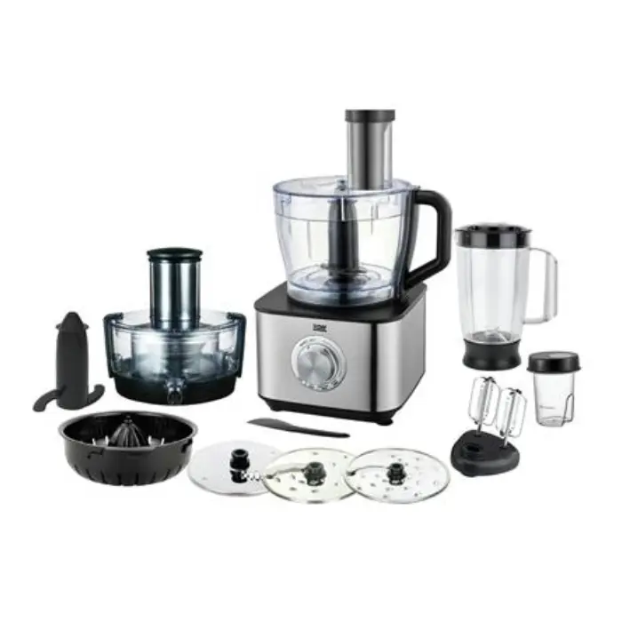 - الملحقات تشمل: قرص للبشر/قرص للتقطيع الخشن/قرص لتقطيع البطاطس/خفاقة للبيض/خلاط بلاستيكي/مطحنةبلاستيكية/شفرة العجين/شفرة للفرم والتقطيع/ملعقة مساعدة.